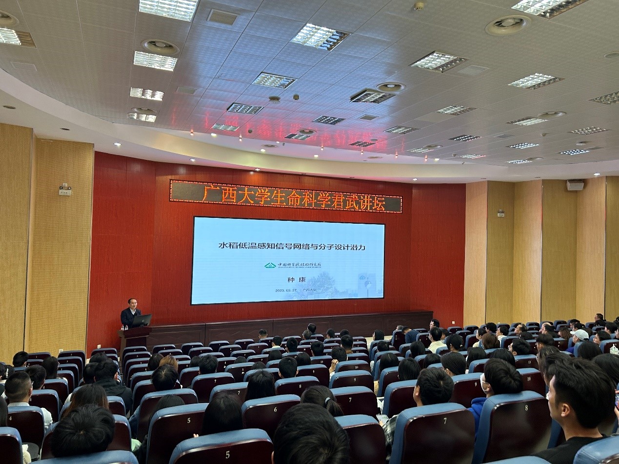3月27日下午,中国科学院院士、国际欧亚科学院院士种康应邀做客我院“生命科学君武讲坛”,作了题为“水稻低温感知网络与种质分子设计潜力”的报告。报告会由何正国院长主持。生命科学与技术学院、亚热带农业生物资源保护与利用国家重点实验室(国重室)、农学院等相关部门师生代表200多人听取了报告。