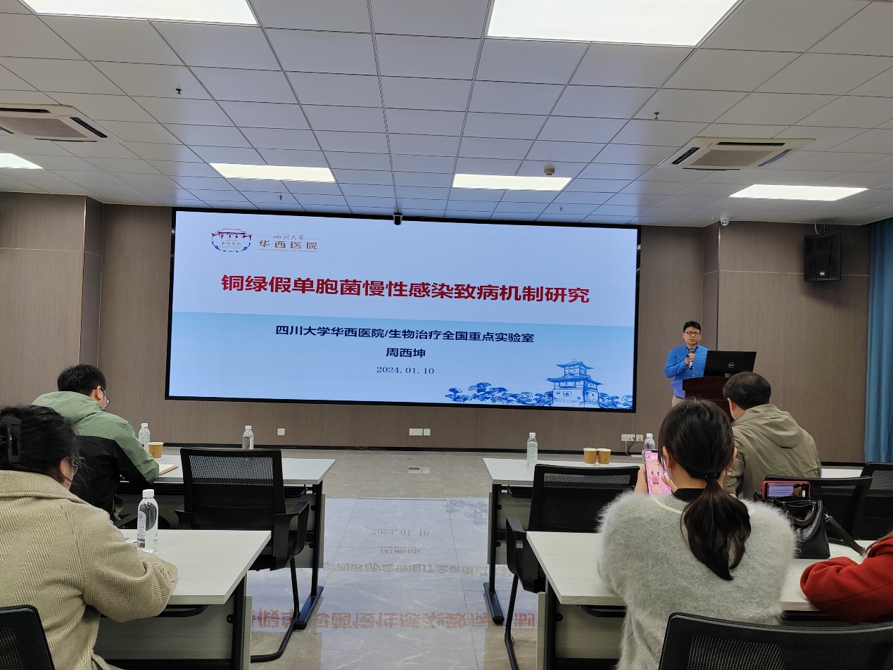周西坤教授作了题为“铜绿假单胞菌慢性感染致病机制研究”的学术报告。报告主要介绍了三部分的研究进展:1、COPD患者气道中存在多态铜绿假单胞菌群体,lasR野生型合作者和突变欺骗者介导的公共产品博弈稳定了社会合作,通过共同抑制宿主免疫促进慢性感染的发展;2、抗生素干预影响不同病原菌的相互作用,突出了群体感应系统在铜绿假单胞菌与其他种类细菌互作中的重要性;3、病原细菌慢性呼吸道感染诱发低烈度的慢性炎症反应,可通过募集MHCIIhi中性粒细胞促进乳腺癌肺转移。