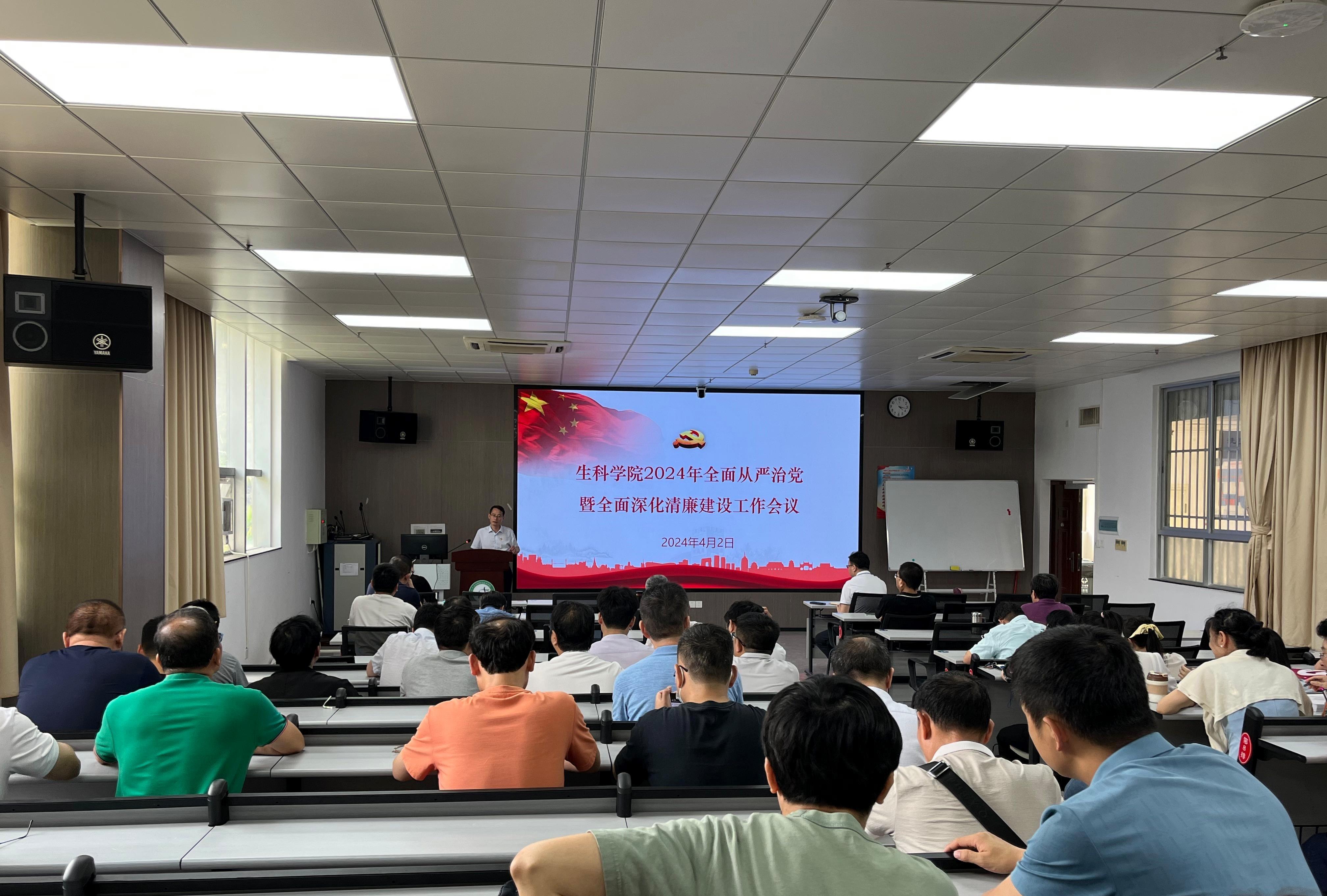 4月2日,我院在106室召开2024年全面从严治党暨全面深化清廉建设工作会议。全院教职工参加会议。学院党委副书记覃文月主持会议。