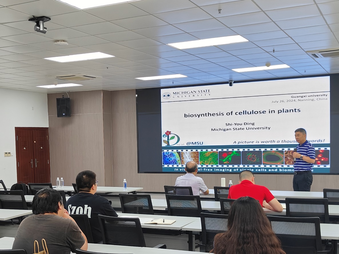 7月26日,广西大学生命科学与技术学院在国家重点实验室107多功能会议室成功主办了“海外名师大讲堂”。美国密歇根州立大学植物生理系丁士友教授应邀作题为Biosynthesis of cellulose in plants的学术报告。此次报告由广西大学生命科学与技术学院副院长赵帅教授主持。