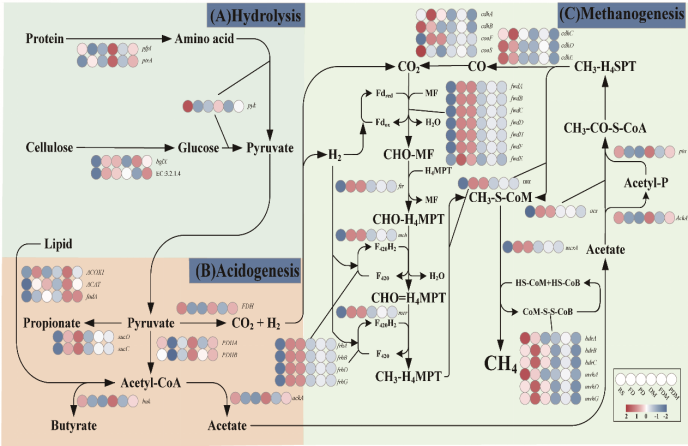 图3 重构的微藻与糖蜜酒精废水共消化过程中(a)水解、(b)产酸和(c)产甲烷生成相关的关键基因丰度的变化规律