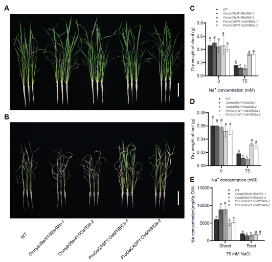 图3野生型、Osmyb39a/41/92a/92b突变体以及OsMYB92a过表达株系耐盐性分析