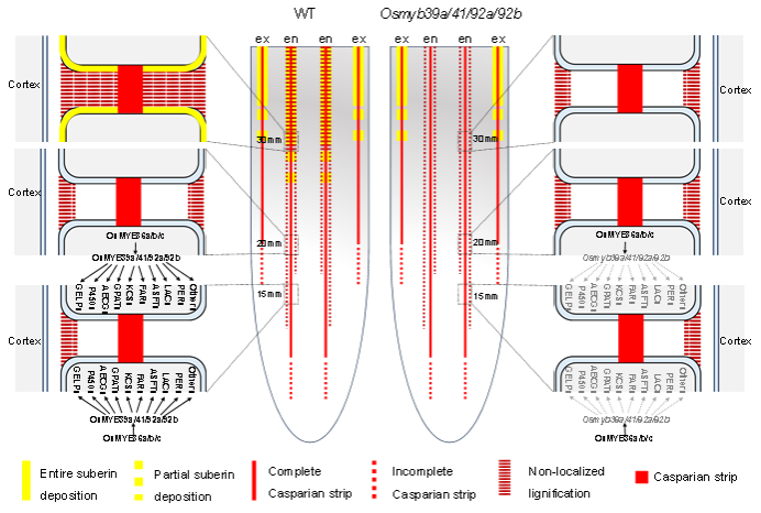 图4 OsMYB36a/b/c-OsMYB39a/41/92a/92b模块调控水稻内皮层木质化和木栓化的模式图