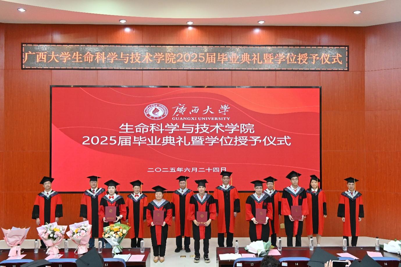 在拨穗礼环节,学院学位评定分委员会委员为2025届毕业生逐一拨穗正冠、颁发学位证书并合影留念。