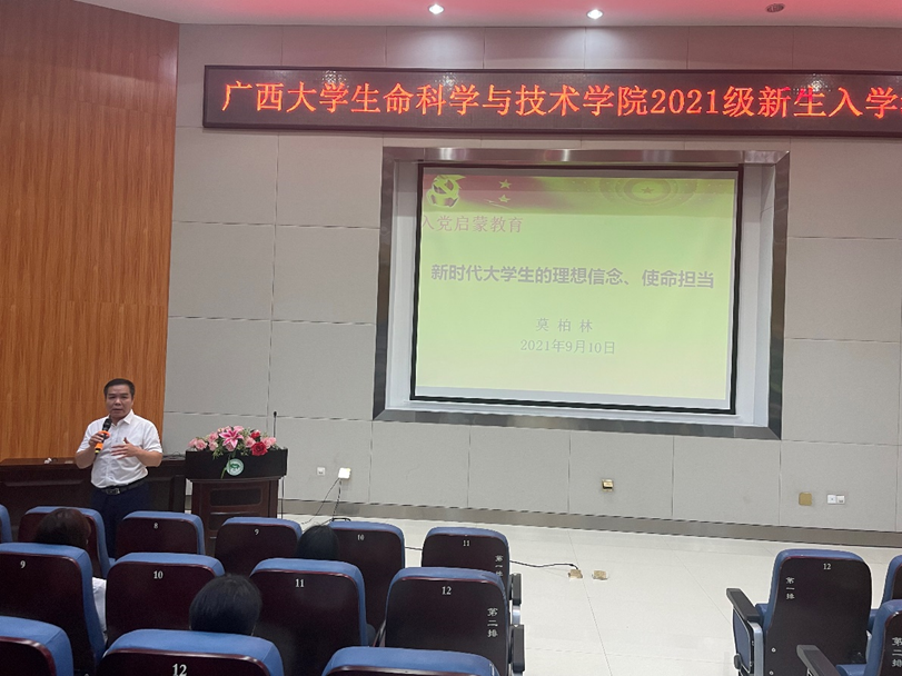为加强新生对党的认识,强化大学生理想信念教育,引导学生积极向党组织靠拢, 9月10日下午,我院党委书记莫柏林在国家重点实验室圆形报告厅给2021级本科生做了题为“新时代大学生的理想信念、使命担当”的入党启蒙教育。