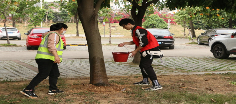 3月12日上午,我院组织30余名学生与西大博世科服务业绿化主管黄兰英、运营工程师邱彦琮、物业班长罗春凤一起在生科院前的小树林开展了“树木养护”活动。