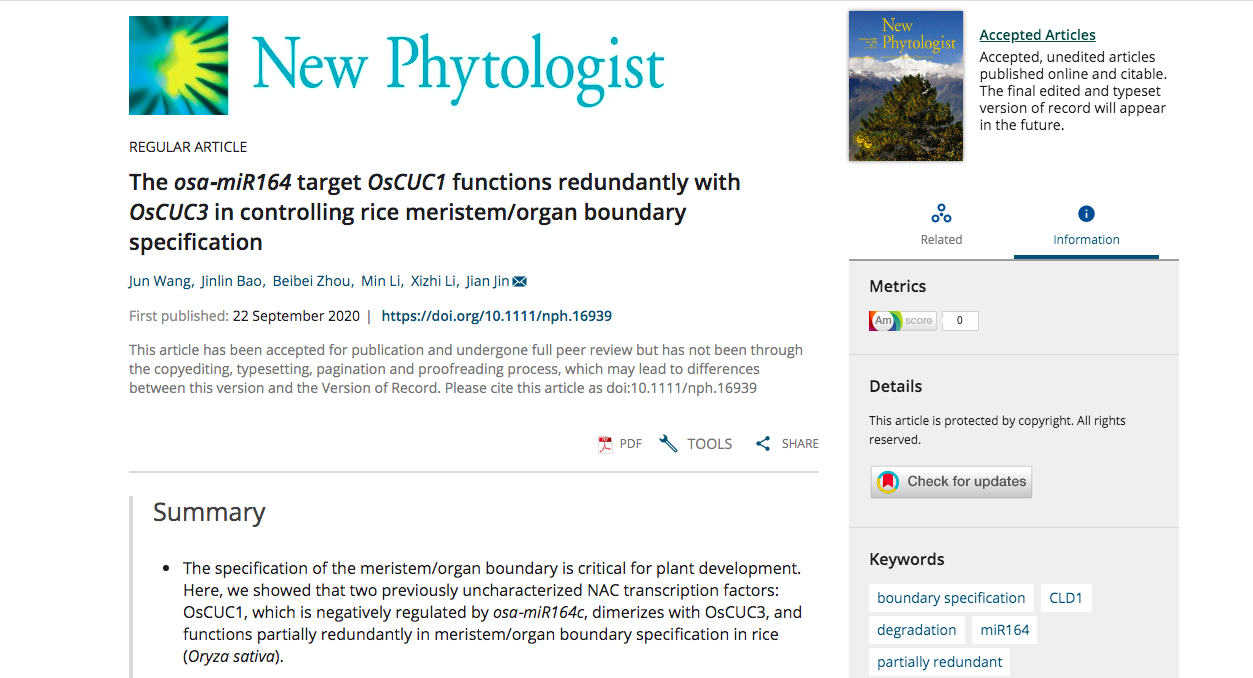 9月22日该课题组在国际著名学术期刊 New Phytologist(IF2019=8.512)上独立在线发表题为“The osa-miR164 target OsCUC1 functions redundantly with OsCUC3 in controlling rice meristem/organ boundary specification”的研究论文,该研究证明两个之前未被报道的NAC转录因子OsCUC1(受到osa-miR164的负调控)与OsCUC3共同参与水稻器官/分生组织边界形成的调控。并对分生组织的维持起到重要作用。此外,OsCUC1与一个已被报道的卷叶相关蛋白 CLD1 相互作用,调控其在细胞核中的稳定性进而控制叶片形态。