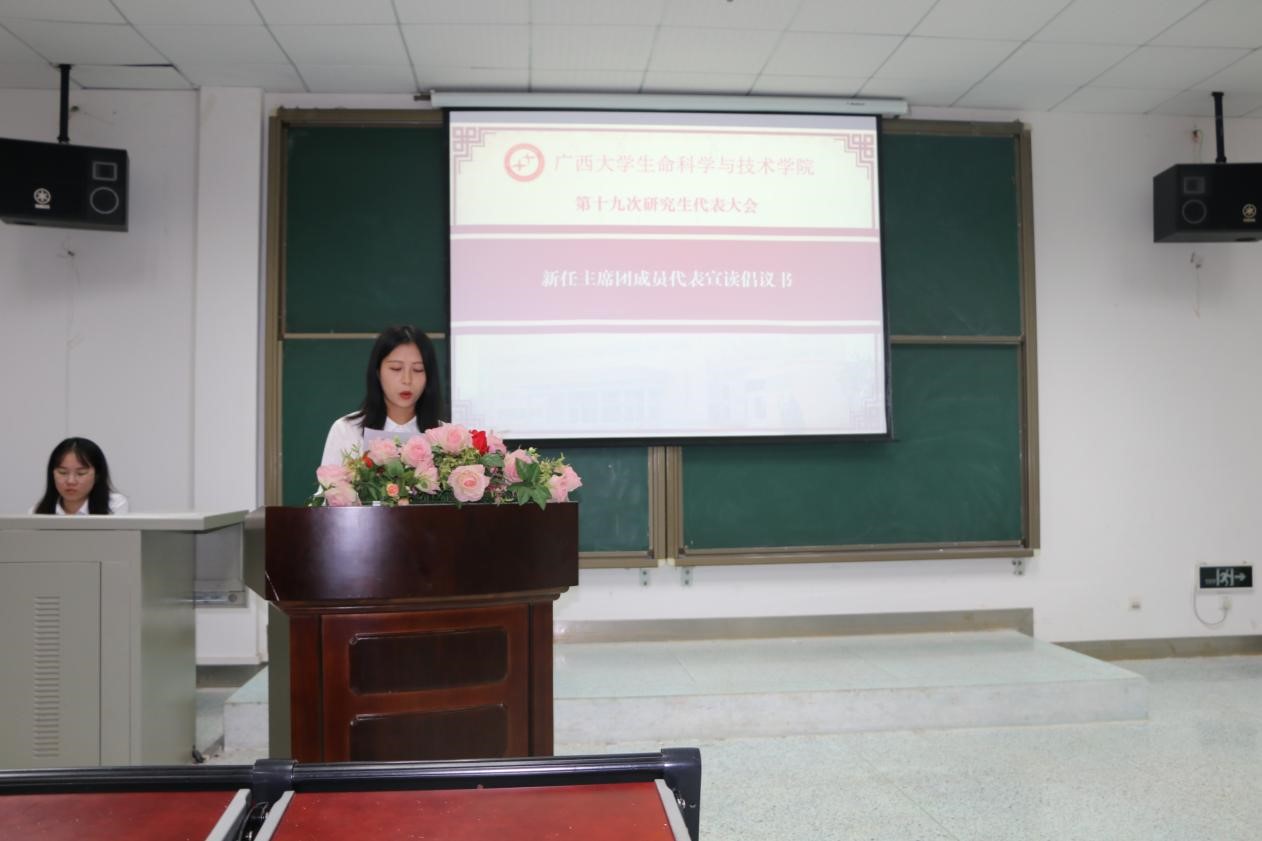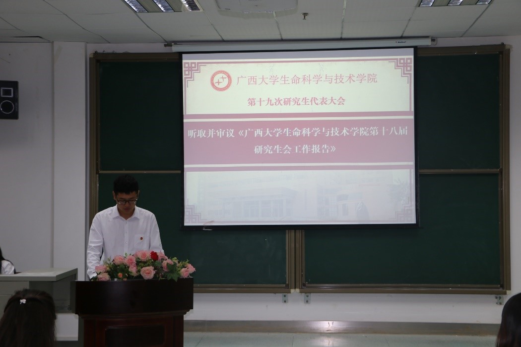 接下来,会议听取并审议表决了《关于〈广西大学生命科学与技术学院研究生会章程 (修正案草案)〉的起草说明》《广西大学生命科学与技术学院第十九次研究生代表大会提案工作报告》《广西大学生命科学与技术学院研究生会章程(修正案草案)》。