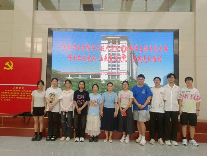 为推动党纪学习教育走深走,2024年6月21日,广西大学生命科学与技术学院生物科学本科生党支部师生党员一行赴广西壮族自治区档案馆开展“传承红色家风,涵养廉洁文化”主题党日活动。