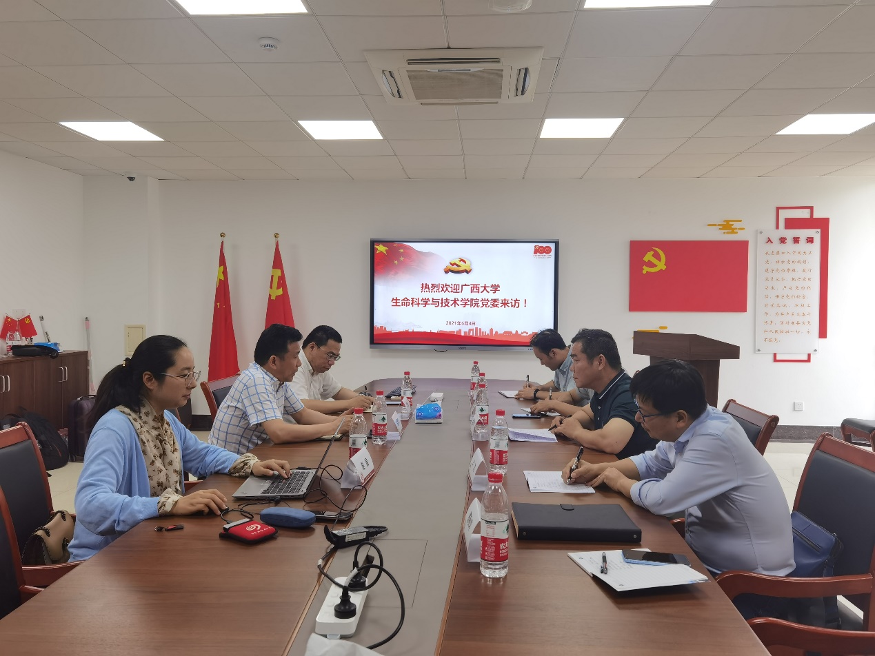 在中国计量大学生命科学学院,该院党委书记周泛海、院长叶子弘、生物系教工党支部书记韩宝瑜、院长助理兼生物系教工党支部副书记陈春等参加了交流会,交流会围绕抓好党建促中心工作、党史学习教育、课程思政建设、党建项目申报的理念、重点和特色工作等方面展开。周泛海书记介绍了学校、学院发展概况以及学院党建工作的理念、重点工作和特色做法;陈春重点介绍了生物系教工党支部作为教育部首批“全国党建工作样板支部”的建设经验及亮点工作。