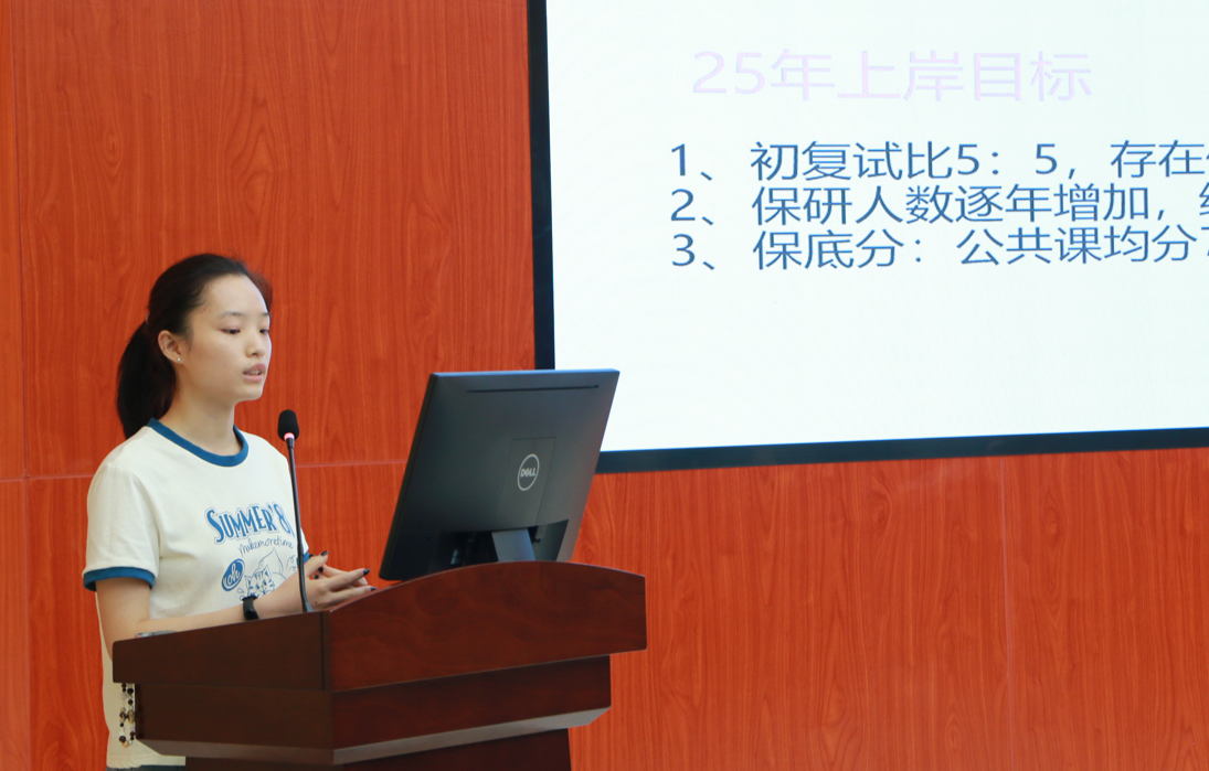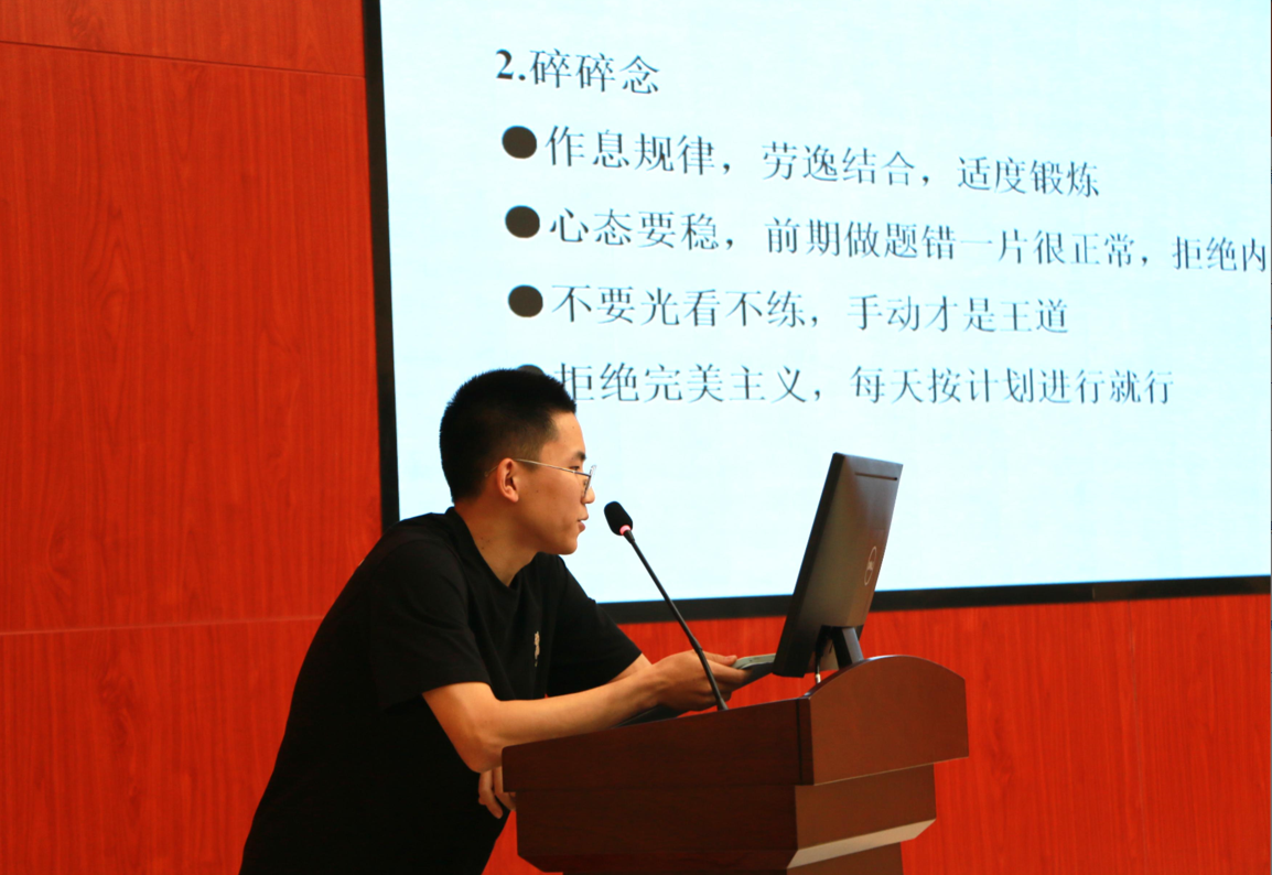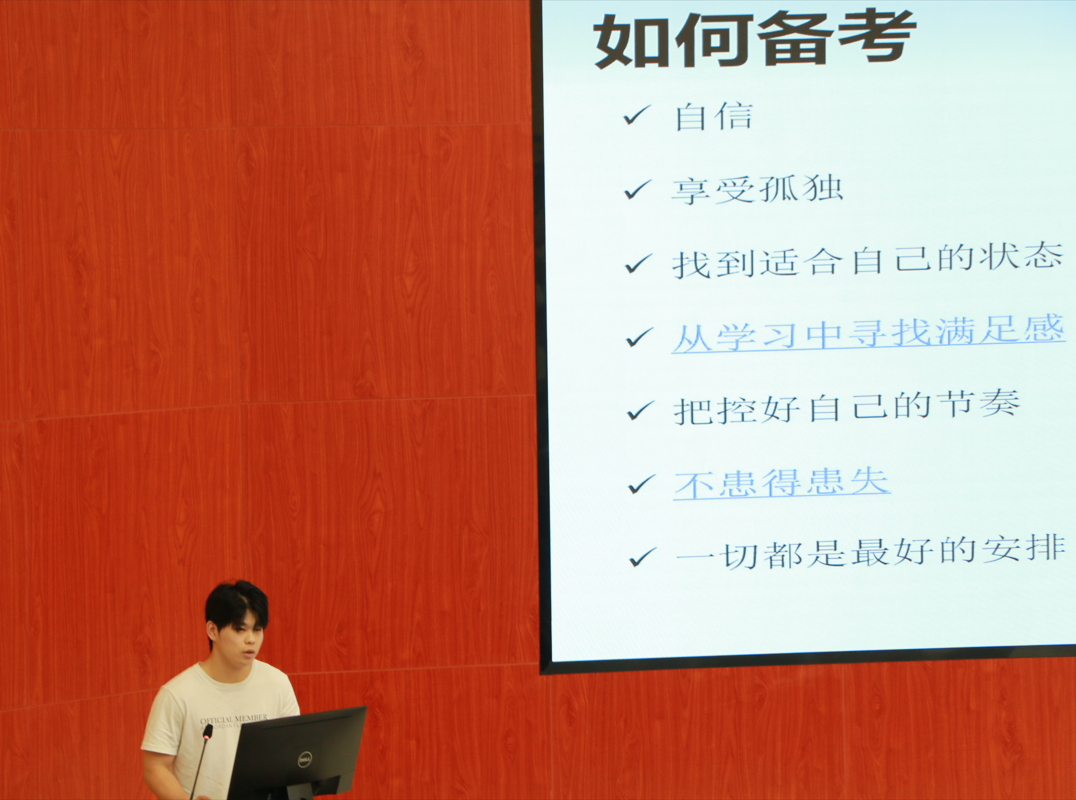 杨金月同学分享了自己获取目标院系考研信息和备考资料的途径,勉励同学们在备考过程中要耐得住寂寞,自律自省,坚定自信,尽量阻断外界,抵制短视频、游戏的诱惑。