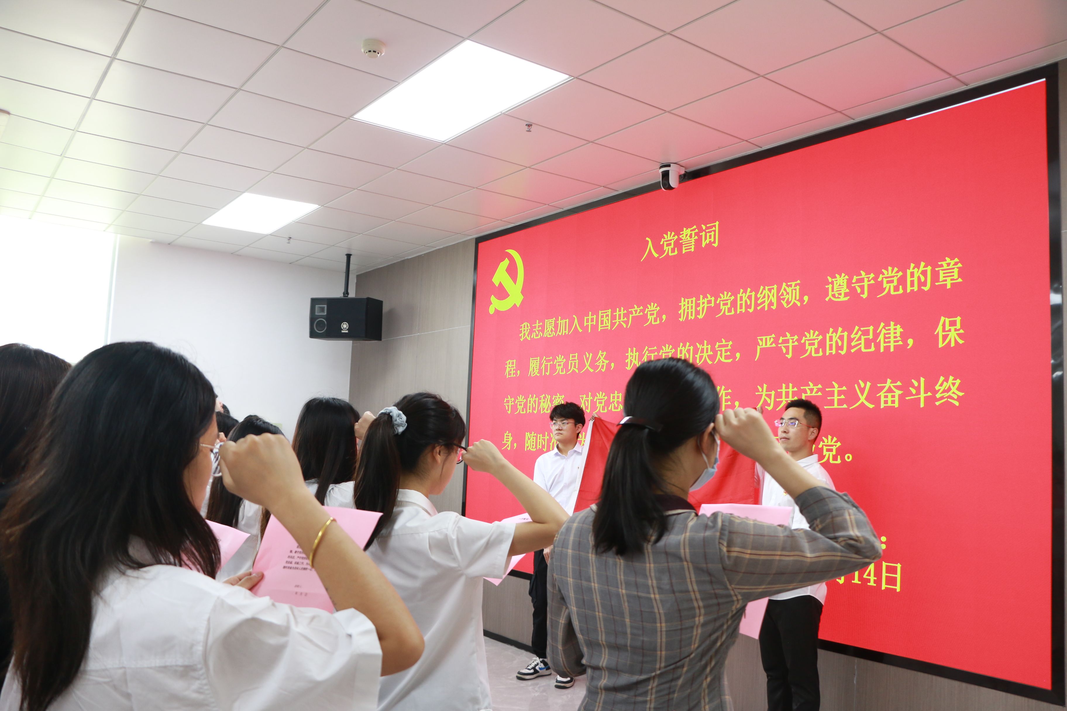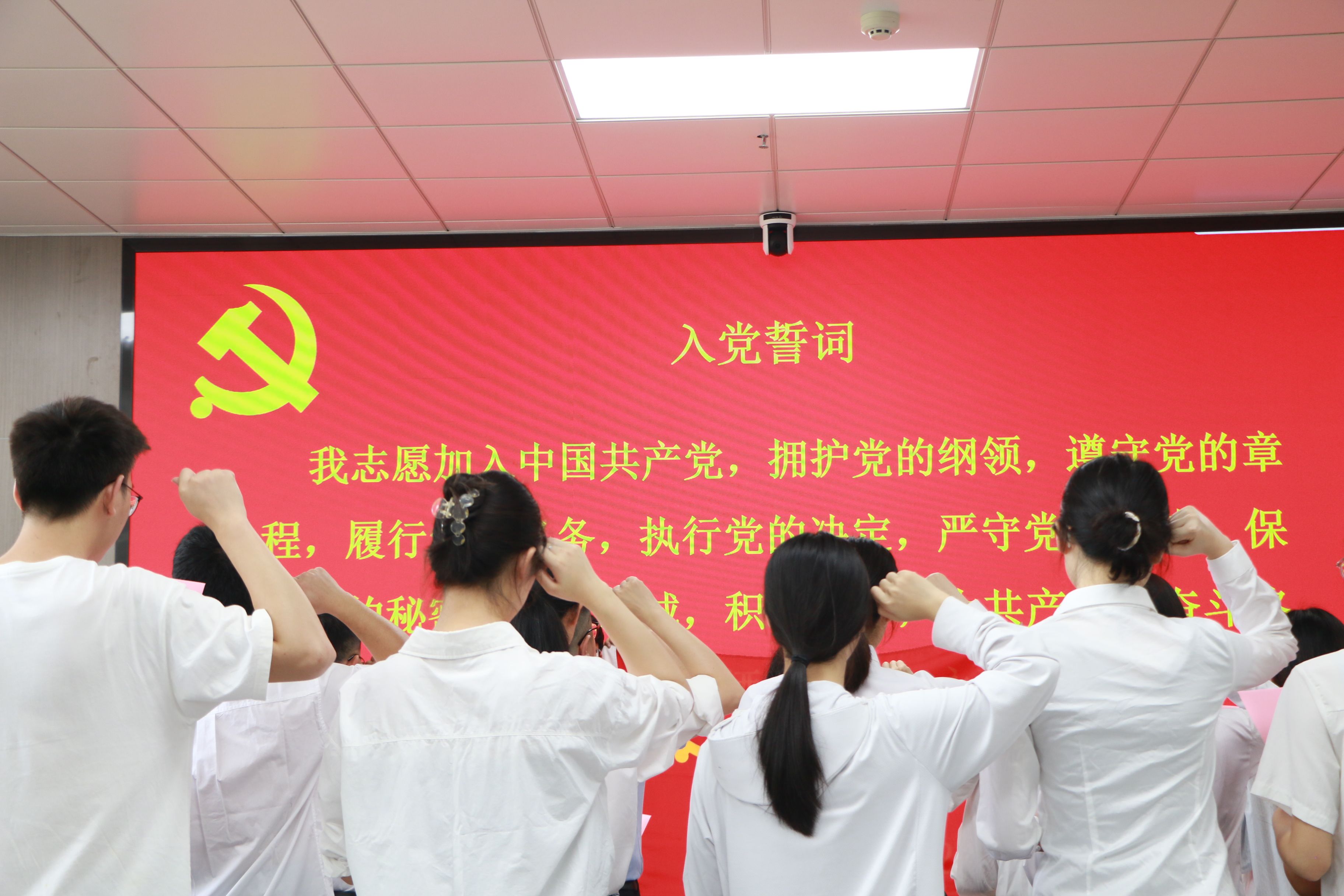 邓玉影代表新党员发言,决心时刻牢记入党誓词,按照党员标准严格要求自己,全面加强党性修养,坚定理想信念,坚持全心全意为人民服务,主动在学习、工作和社会生活中充分发挥党员先锋模范作用,以实际行动积极创造转正条件。