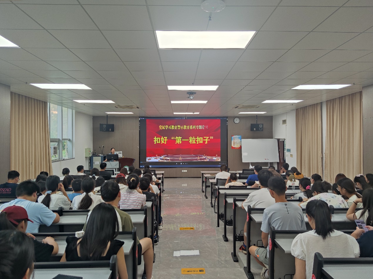 学院党委副书记、纪委书记覃文月以《守纪律、讲规矩,做新时代合格党员》为题作警示教育报告。覃副书记深刻剖析了一些学生党员违反校纪、触犯法律的典型案例,希望同学们以案为戒,严以律己。她指出,作为新时代的学生党员,要始终做好“三个表率”:一要做学纪知纪的表率,始终坚守政治信仰、坚定理想信念、严守政治规矩,当好坚定拥护“两个确立”、践行“两个维护”的排头兵;二要做明纪守纪的表率,严格对照党章,将遵守党规党纪、法律法规、校纪校规作为日常行为的准则,不断磨砺个人品格,塑造良好的道德品质;三要做担当作为的表率,争做学习标兵、科研标兵,以高度的责任感和使命感,共同营造一个风清气正、积极向上的育人环境。