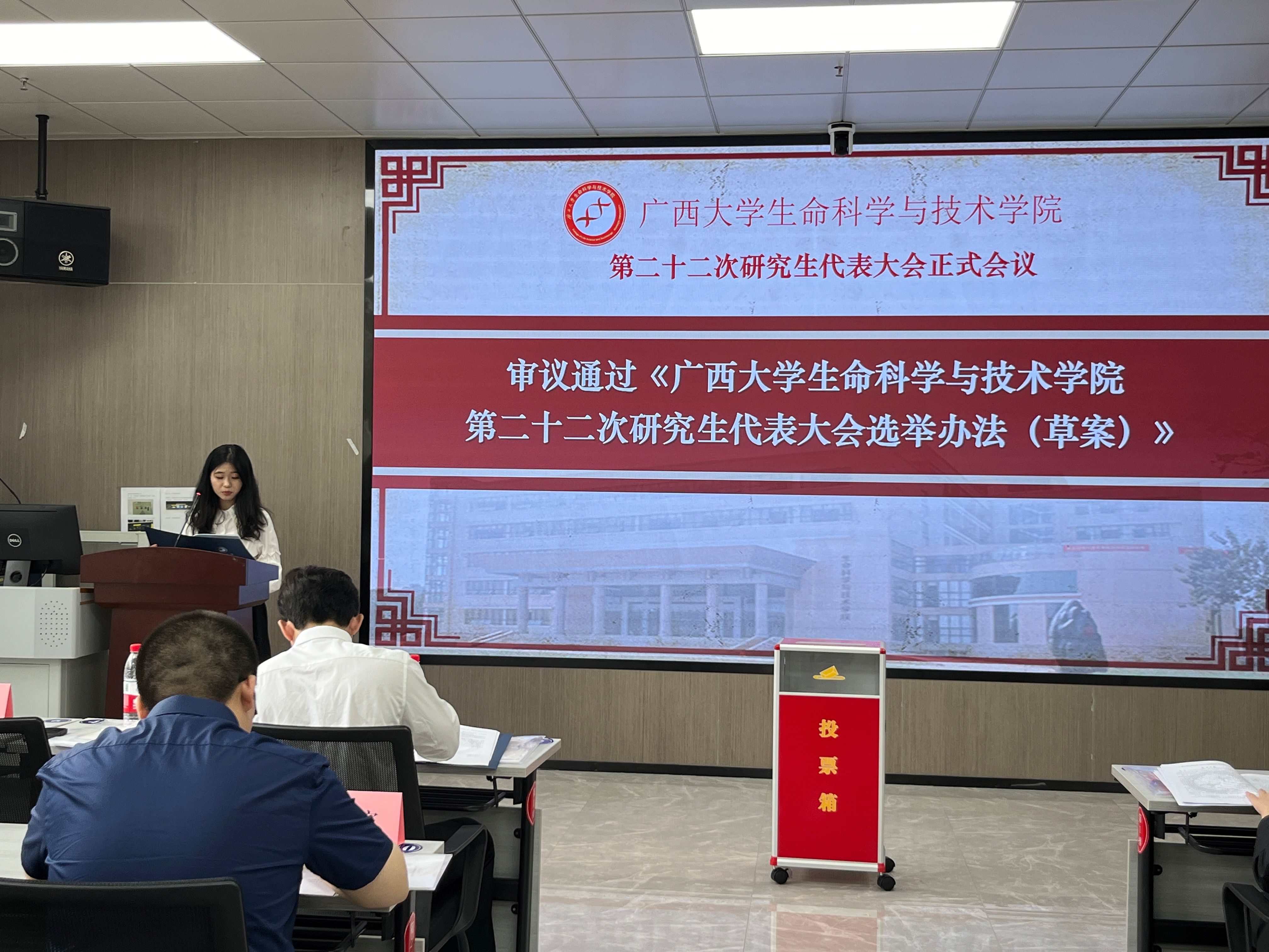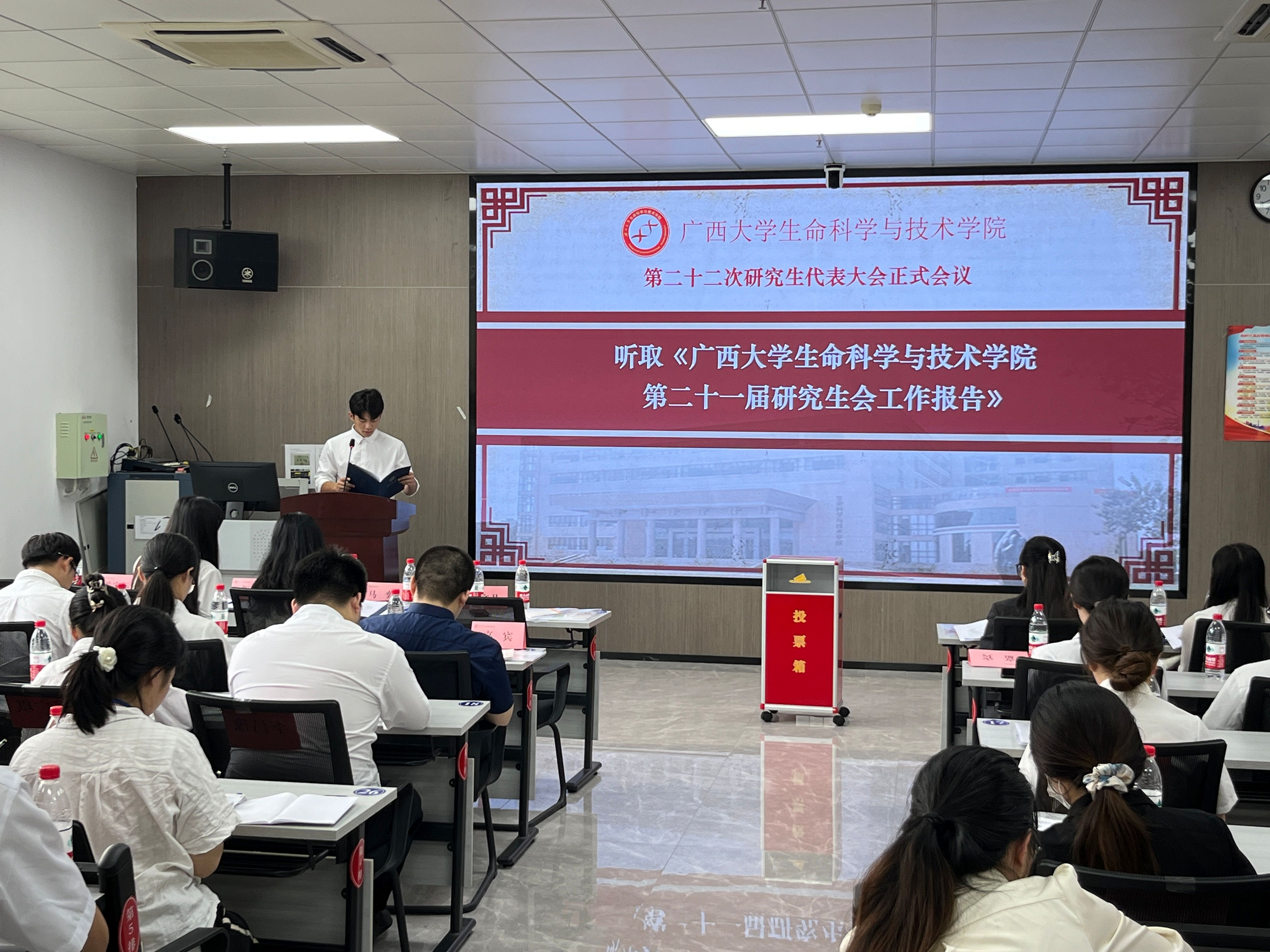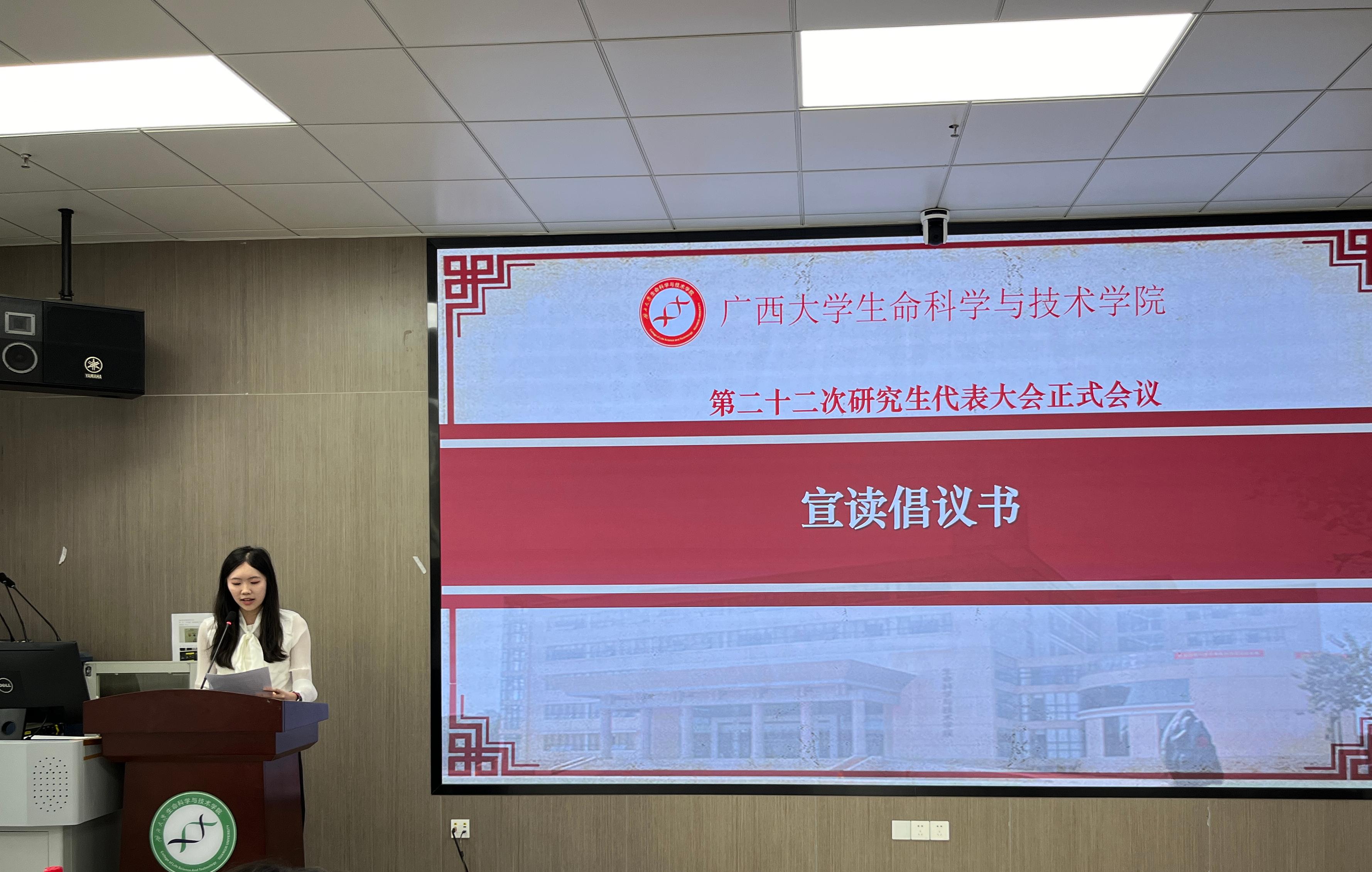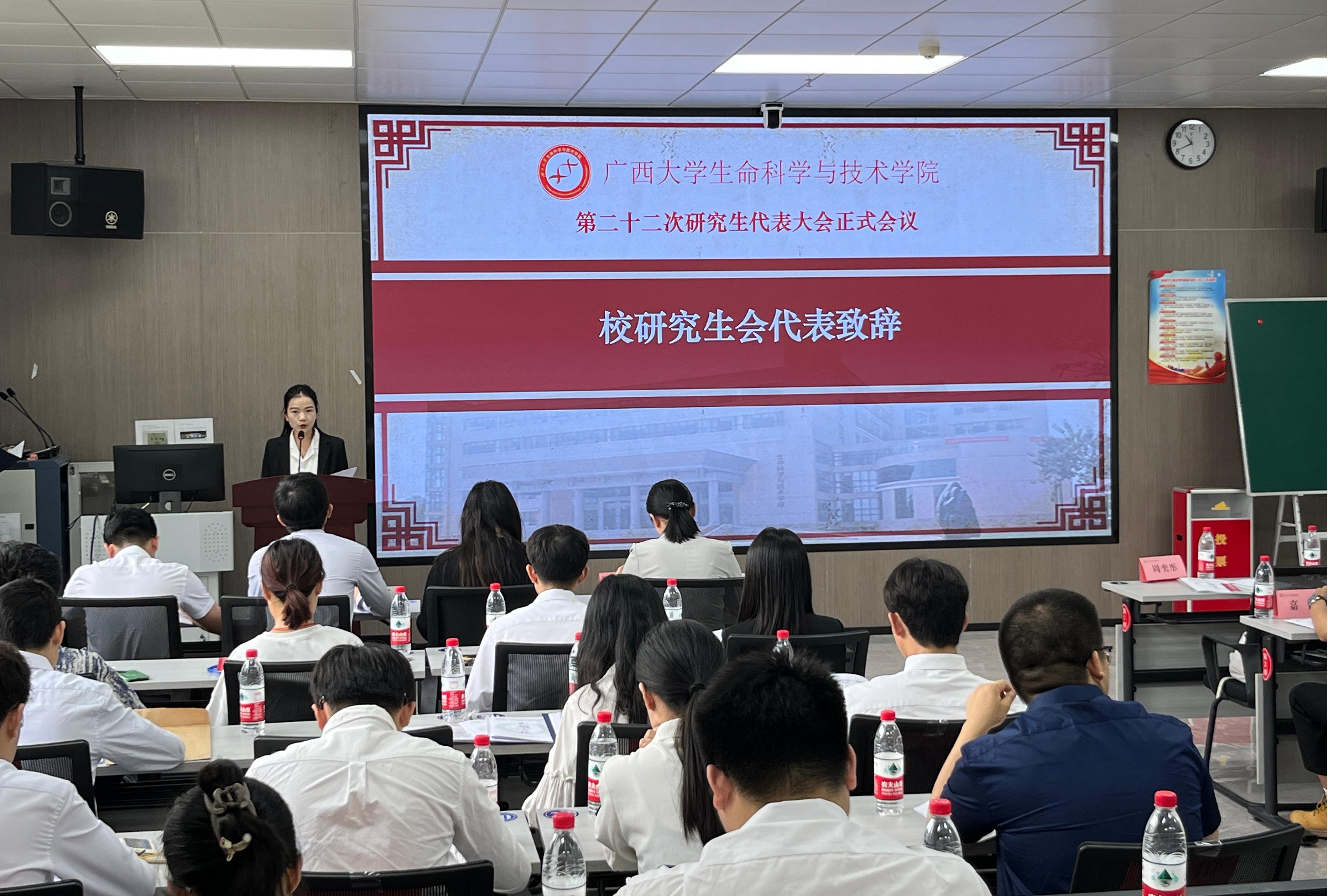 会议第二阶段,第二十一届研究生会轮值主席李昌豫作题为《胸怀国之大者,勇担时代使命,团结引领青年研究生永远跟党走,奋进新时代》的工作报告。会议听取并审议通过了《广西大学生命科学与技术学院第二十二次研究生代表大会选举办法(草案)》。