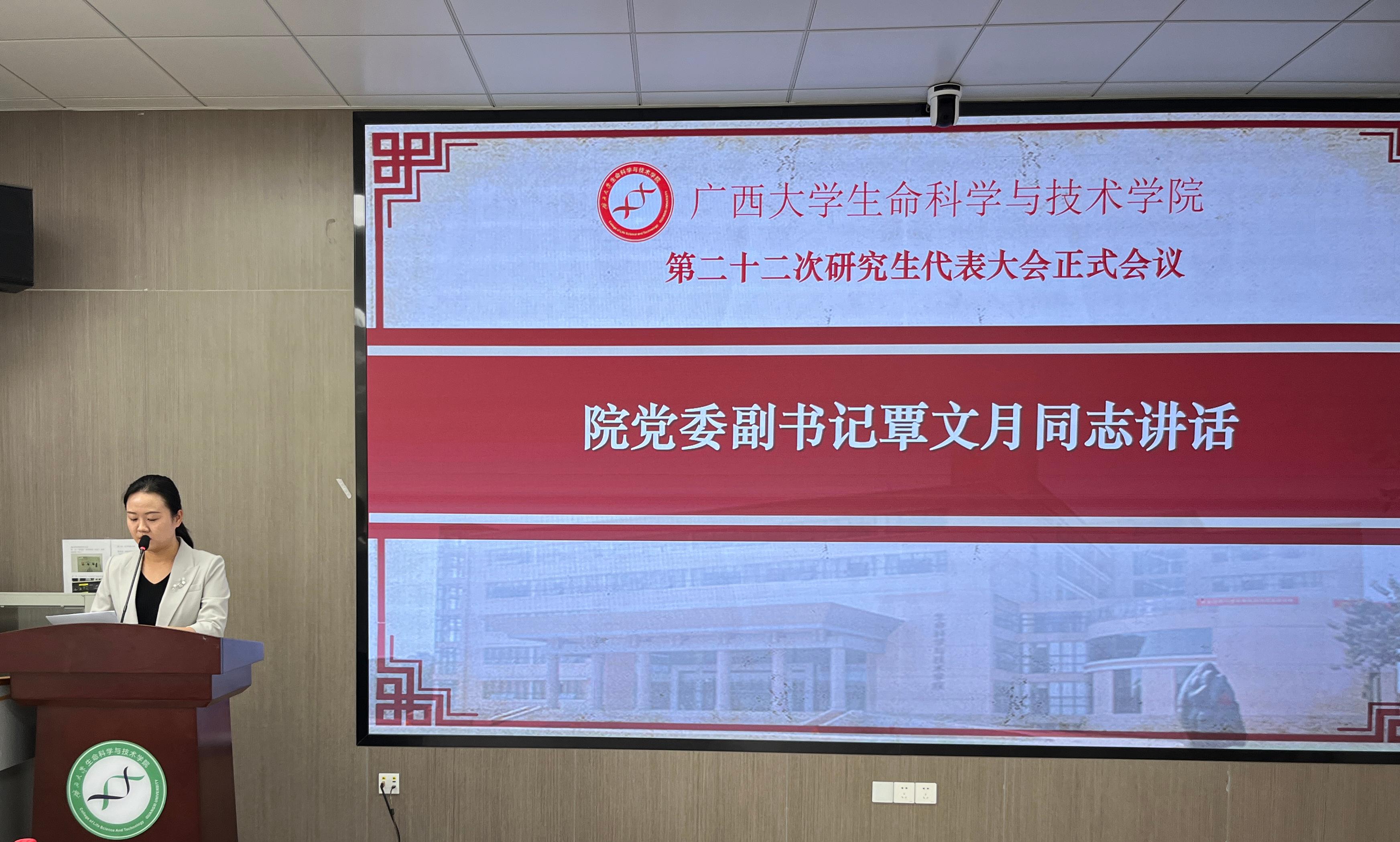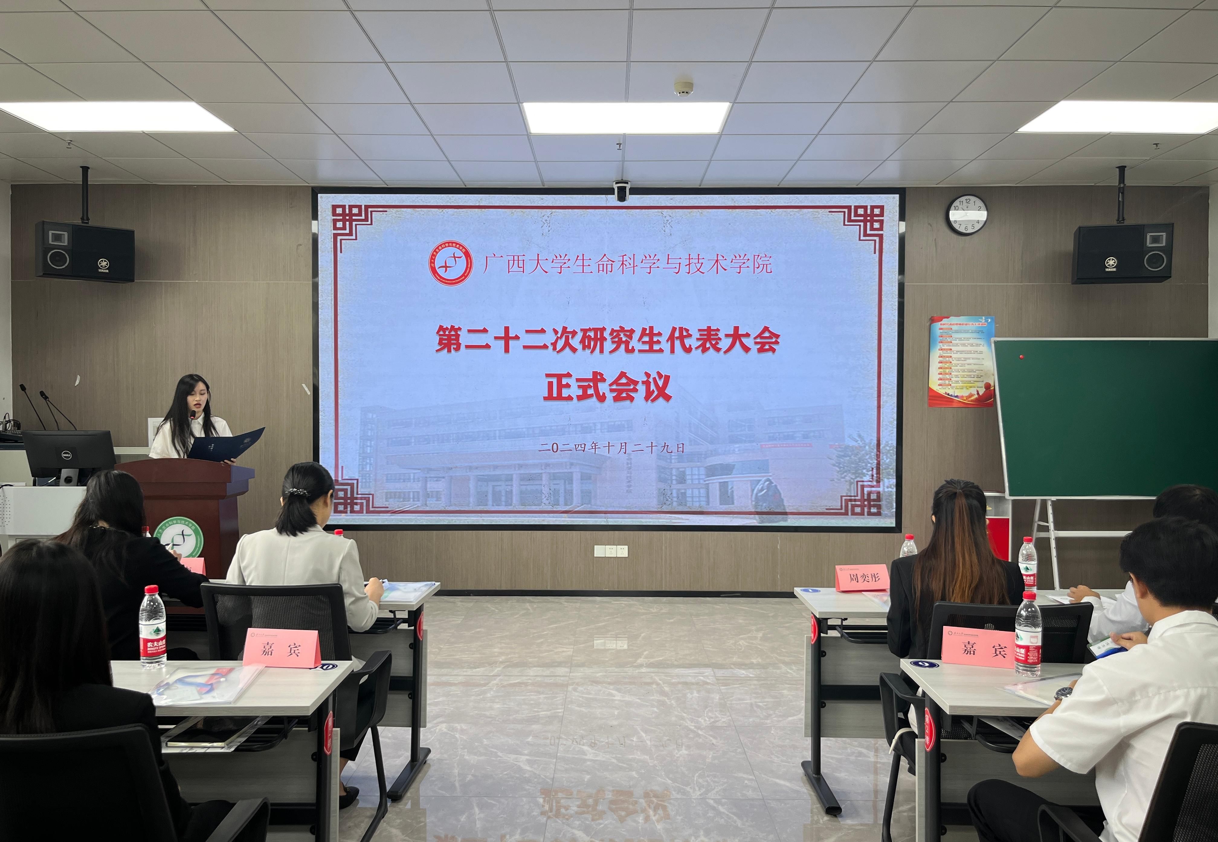 10月29日下午,我院第二十二次研究生代表大会正式会议在学院106室顺利召开。学院党委副书记、纪委书记覃文月,团委书记马奕,学工组辅导员贺超、关家运,广西大学研究生会代表,兄弟学院研究生会代表以及我院各班级代表出席本次大会。大会由学院第二十一届研究生会执行主席李晓玉主持。