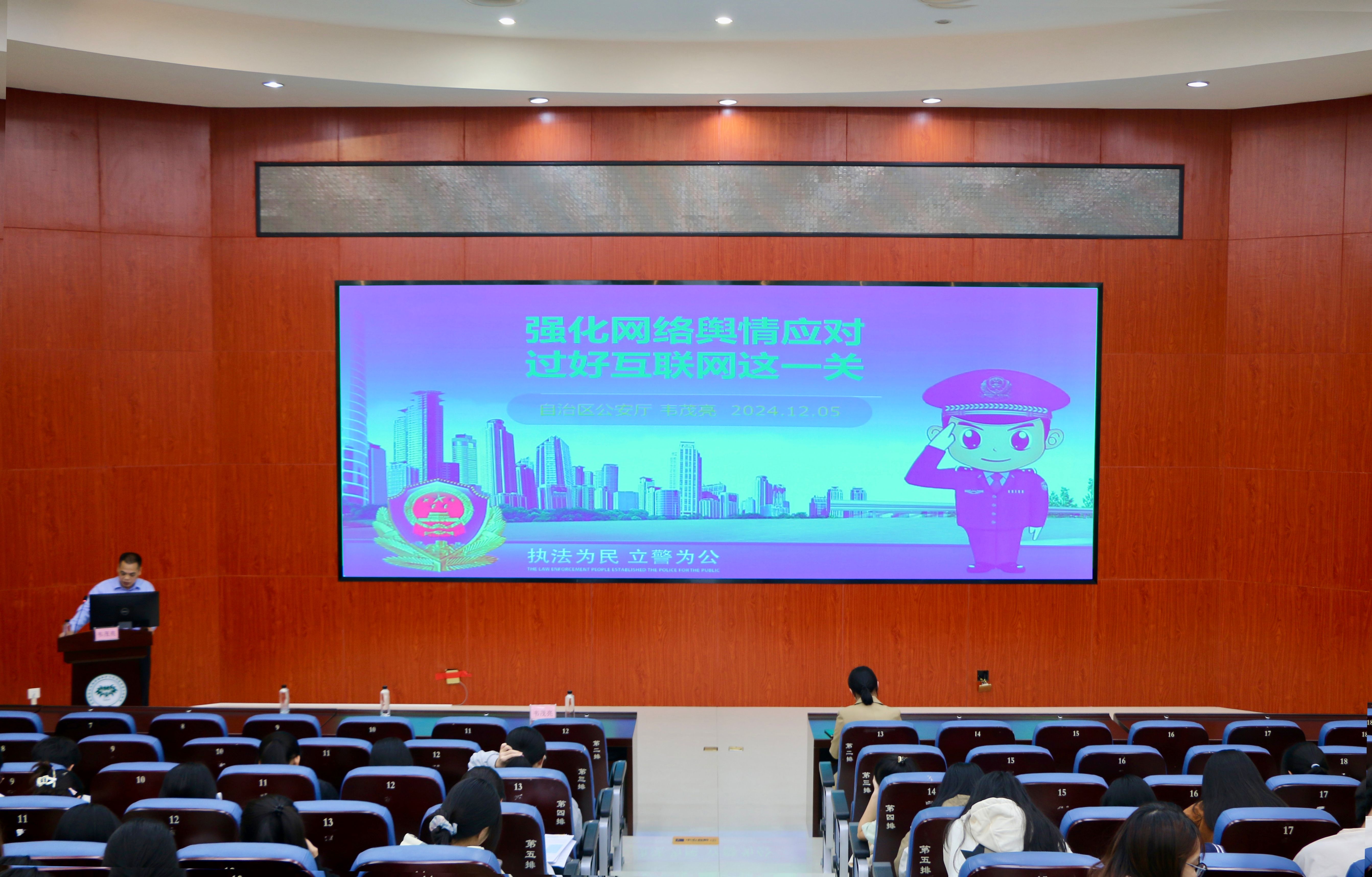 为全面贯彻落实总体国家安全观,教育引导学生提高国家安全意识,增强防范和抵御安全风险的能力,筑牢网络安全防线,12月6日,我院邀请广西壮族自治区公安厅网安总队韦茂亮同志在圆形报告厅给我院学生作新时代大学生网络安全教育专题报告,全体学生党员、学生骨干代表和2024级全体新生参加本次报告会。报告会由学院党委副书记、纪委书记覃文月主持。